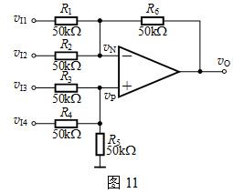9、【单选题】加减法运算电路如图11所示,设运算放大器是理想的,则输出电压和输入电压的关系式为 。