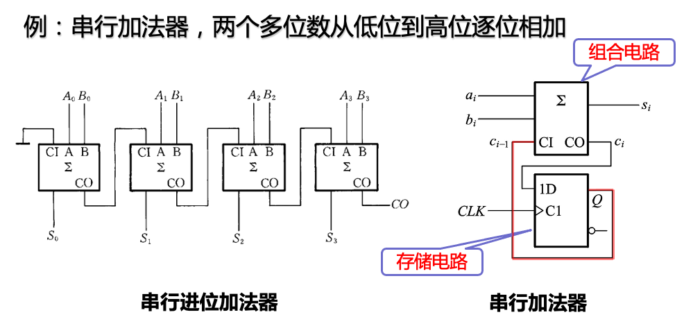 在该图中,加法器逐位输入,结果也逐位输出。进位状态反馈到输入端,与输入变量共同决定输出。