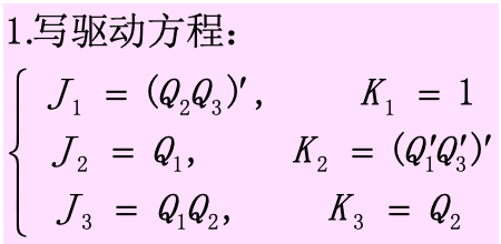 ①从给定电路写出存储电路中每个触发器的驱动方程(输入的逻辑式),得到整个电路的驱动方程。