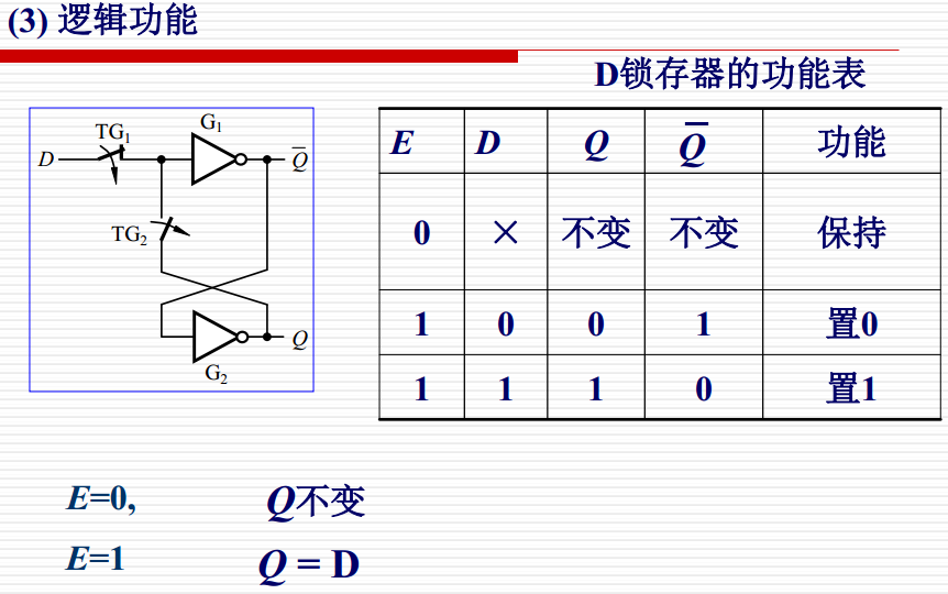 E为1时,C为1,TG1被1驱动导通,TG2被0驱动断开。(TG1为传输门,当C为1时,将输入端的模拟信号整体传输之输出端,无损耗,C为0时门关闭)