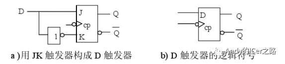 JK触发器可以很方便地构成D触发器,电路图和真值表如下所示。