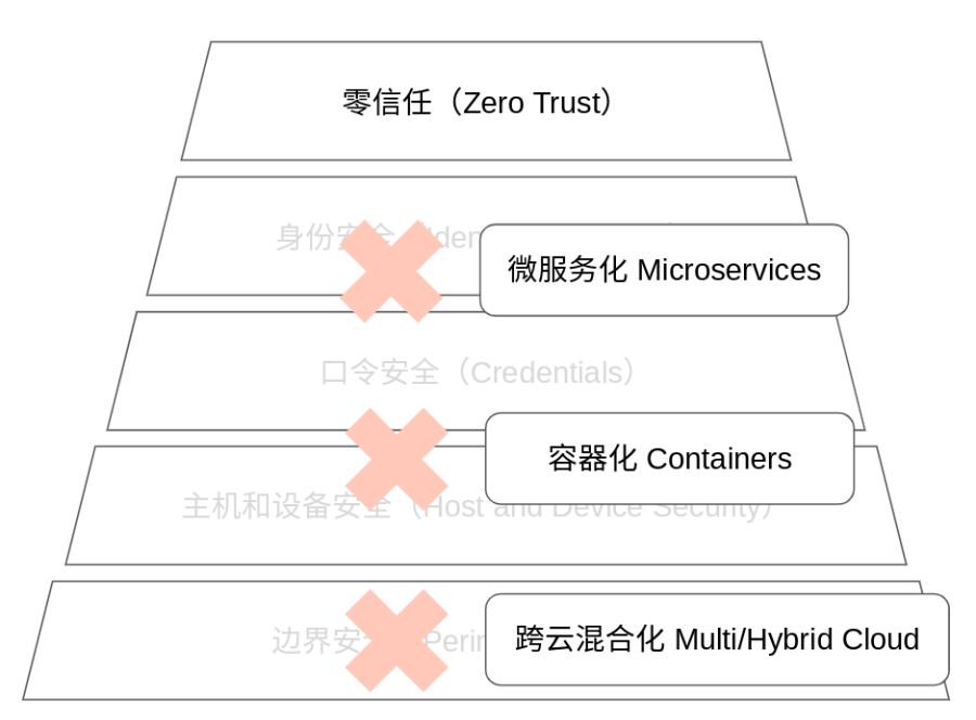 云原生带来了以下挑战:一是企业IT系统已经从单机房模式进化到了跨云混合(multi and hybrid cloud)的模式,这导致了边界的模糊和基于边界保护的安全的低效;二是基于容器(Containers)的计算导致了宿主机的不确定性,同一个服务可能在不断线的情况下随时从一台物理主机迁移到另一台物理主机,这导致了基于主机的安全防护已经无法进一步实现基于服务逻辑的深层防护;三是微服务(Microservice)和细粒度的API增加了攻击面,身份和角色已经不单单是终端用户的身份和角色,而是微服务之间交互时的更细粒度的身份和访问控制。