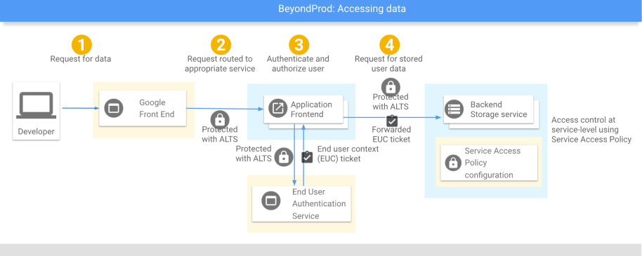 当用户通过谷歌的服务访问自己的数据时,请求会通过用户和Google Front End(GFE)之间的加密连接(TLS)首先到达GFE。GFE转用更加高效和安全的协议和数据结构将用户请求分发到各个后端服务共同完成用户请求。例如TLS会被换为Application Layer TLS(ATLS)。面向用户的口令会被转换为更加安全的End User Context Ticket(EUC)。这些置换旨在根据实际请求降低内部连接和令牌的权限,使得特定的ATLS和EUC只能访问局限于此次请求的数据和权限。