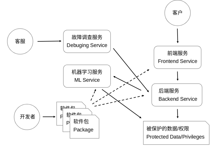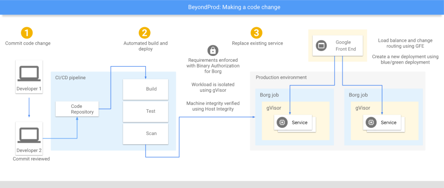 当开发者希望通过改变服务的代码来改变一个服务的数据和权限访问行为时(开发者无法获取生产主机的任意指令运行权限,如SSH),该代码修改会经过一系列的流程来将对开发者及其团队的信任转化为对新的服务的信任:流程中所有涉及的人员均通过多因子认证来确立身份,代码修改会被一个或以上有审批权限的人评估,只有获得足够多的授权的代码才会被合并入中央代码库,中央代码库的代码会被一个同样受BAB保护的可信构建服务集中构建,测试和签名,构建后的软件会在部署环节通过目标服务的BAB策略认证(比如GMail的服务只能运行代码库特定位置的经过充分代码评估和测试的代码),软件运行时也会根据相应的BAB安全策略进行运行时隔离:不同BAB服务策略管辖的服务会被运行在不同的隔离区。