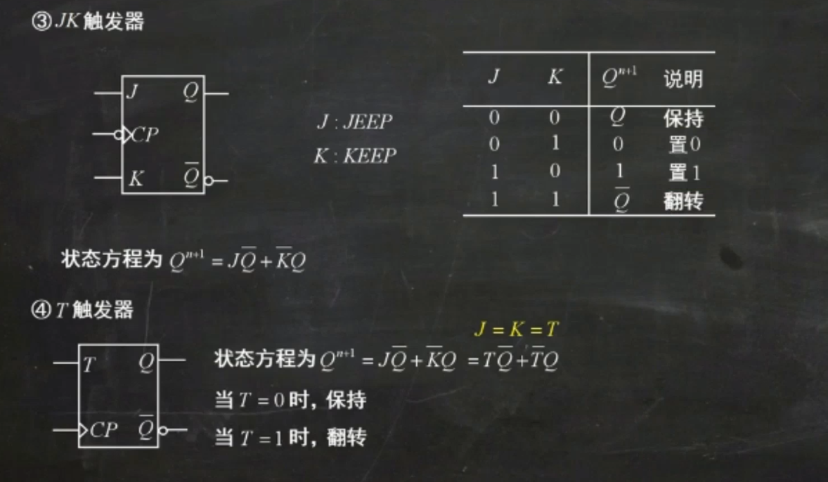 t=0时,次态=现态;t=1时,次态与现态相反,触发器翻转。