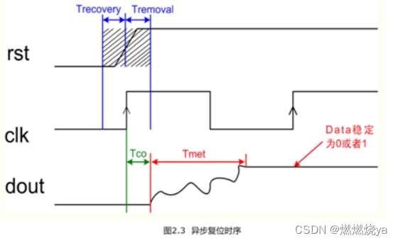 异步复位信号撤销时间在Trecovery和Tremoval之内,则会造成亚稳态,在时钟上升沿Tco(输出延时)后会产生振荡,振荡时间为Tmet(决断时间)。