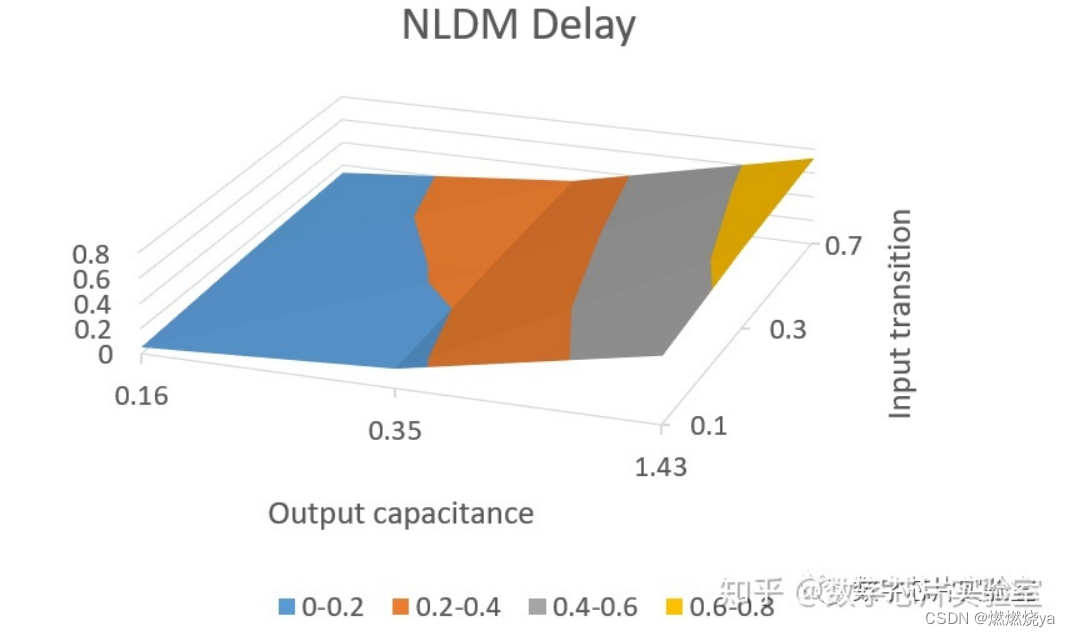 LDM根据input transition time和output capacitance获得cell的不同timing arcs的延迟。也就是说,NLDM模型是一个二维的查找表,其中两个输入变量是inputtransition time和output capacitance,表中的内容是该timing arcs的延迟。