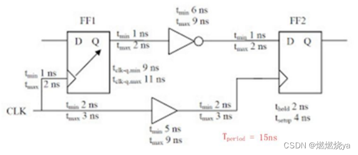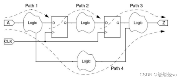 1.时间裕量分析首先需要将电路中的路径找出来。路径的起点有两种:时序器件的时钟输入端、电路的起点;终点也有两种:时序器件的数据输入端、电路的终点。如下图所示,一共有四种路径。