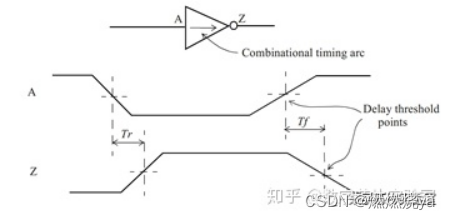 以最简单的反相器为例,所谓cell的时序信息,即图中的传播延时Tr和Tf