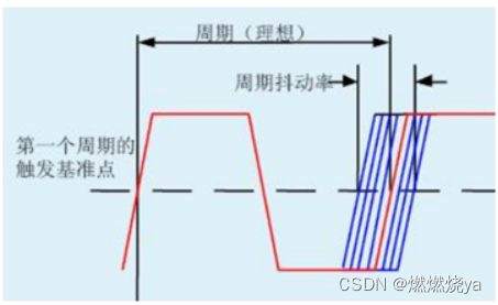 在理想情况下,一个频率固定的完美的脉冲信号(以1MHz为例)的持续时间应该恰好是1us,每500ns有一个跳变沿。但这种信号并不存在。如图所示,信号周期的长度总会有一定变化,从而导致下一个沿的到来时间不确定。这种不确定就是抖动(jitter)。时钟抖动也永远存在。