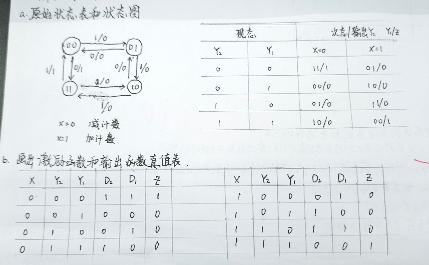 要求:实现以4为模的递增计数以及递减计数功能,(当X=0时,减1计数;当X=1时,加1计数;循环计数末端有进位输出或借位输出),原始状态图见图3.3.1所示(图中上面1/10改为1/0,是X/Z)。