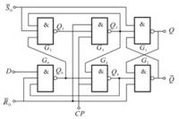 1.CP=0时,与非门G3和G4封锁,其输出Q3=Q4=1,触发器的状态不变。同时,由于Q3至Q5和Q4至Q6的反馈信号将这两个门打开,因此可接收输入信号D,Q5=D非,Q6=Q5非=D。