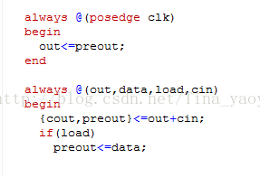 3、此部分是后续添加的,在学习过阻塞式及非阻塞式赋值后来解决第二部分所出现的问题。看上面图片的代码,第一个always过程块表示一个时序电路,采用非阻塞式赋值肯定没有问题。但第二个always过程表示一个组合逻辑,不适合采用非阻塞式赋值,这是因为当load值变化为1时,preout置为data,即为0101,这个没错,但当load为0时,就只执行{count,preout}<=out+cin;而这个非阻塞赋值等号右边参与运算的是out的初始值,而out的初始值为未知值x,因此,cout和preout保持为未知值x。采用阻塞式的仿真图如下:值得特别注意的是,当always过程块表示一个时序电路时,过程块中的赋值必须为非阻塞式赋值,而当always过程块表示一个组合逻辑时,过程块中的赋值必须为阻塞式赋值。