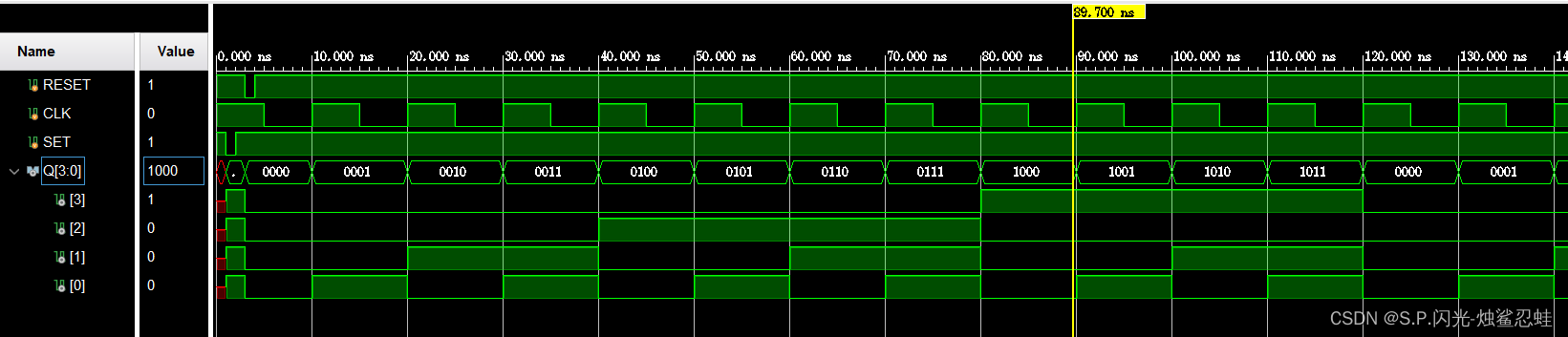 发现Q是有输出的,原程序的思路是如果记到12(但是原程序写的可能是到13)就触发一次RESET,使得全部置0,不知为何有问题。