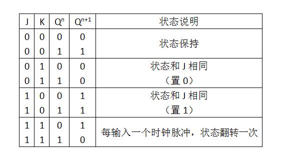 ②当CP=1时,触发器接受输入,J、K输入信号可改变触发器状态,下面对J、K各个状态加以说明: