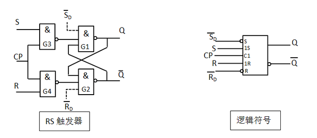 在RS锁存的基础上增加两个门G3、G4,再加上时钟脉冲就组成了RS触发器。G3、G4由时钟脉冲控制,CP为时钟脉冲输入端,R、S为信号输入端。如下图: