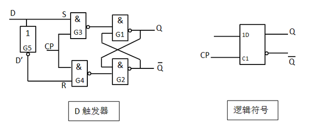 为避免RS触发器的R、S信号输入同时为1时,触发器出现不定的状态,在RS触发器的输入端R、S之间加入一个非门G5,这样触发器的R、S输入就不会相同,这种触发器称为D触发器,如下图: