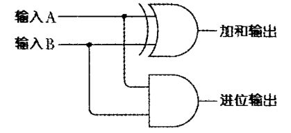 可以将与门和异或门连在一起来计算两个二进制数(即A和B)的和: