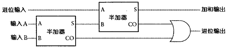 为了对三个二进制数进行加法运算,需要将两个半加器和一个或门做如下连接: