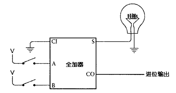 最终,第8个灯泡和最后一对开关将以如下方式连接到全加器上: