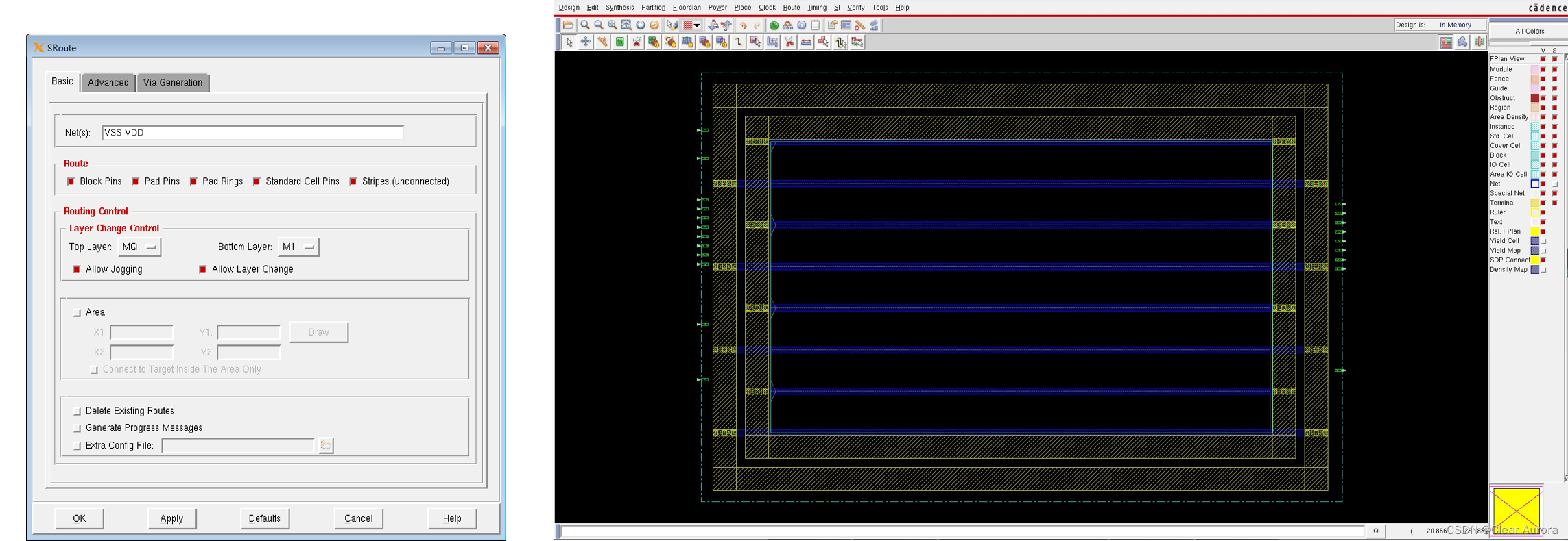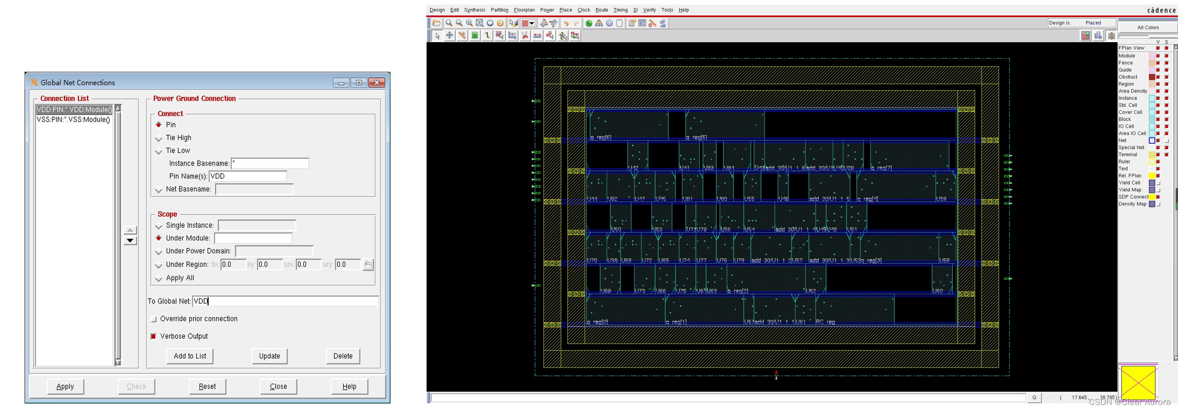 10)FloorPlan -> Connect Global Net连接所有电源和地,如下左图,Place -> Place Standard Cell,把标准逻辑单元放入,结果如下右图: