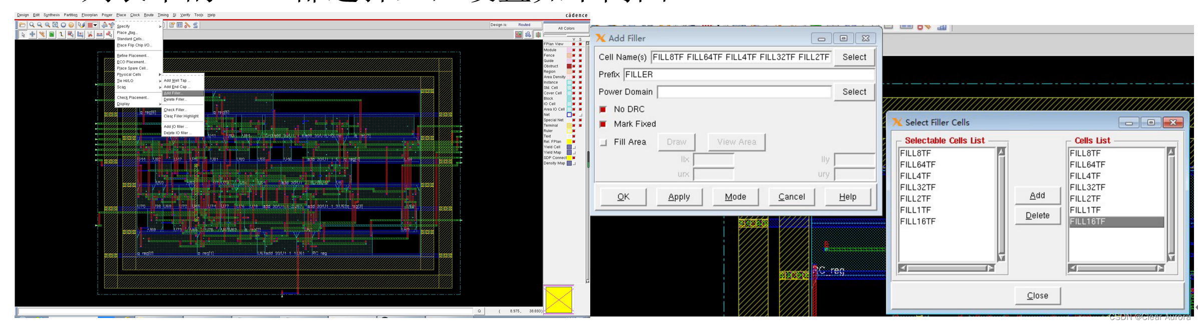 13)Place—>Physical Cells —>Add Filler,在Cell List栏选择Filler的Cell名,将Cell列表中的Cell都选择上,设置如下两图: