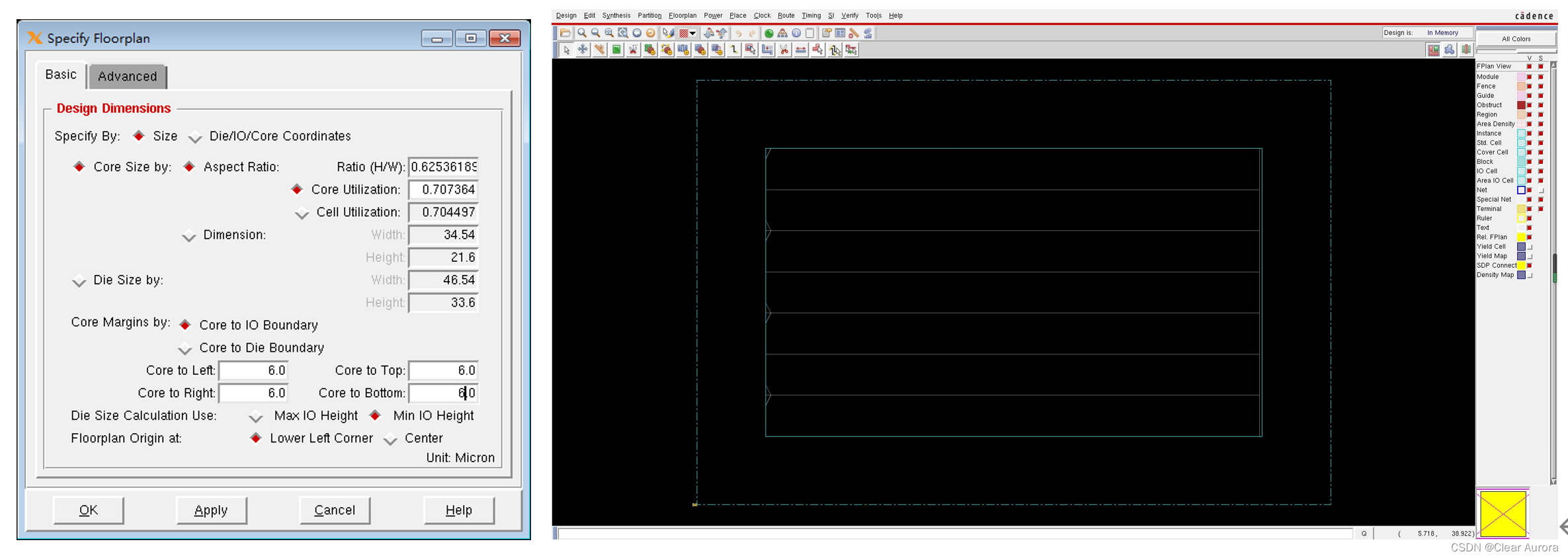 6)FloorPlan -> Specify Floorplan 进行版图的平面规划,设置与结果如下两图: