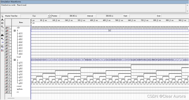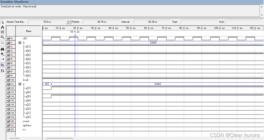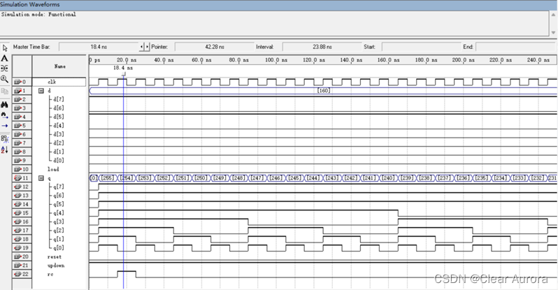 上图为预置数输入10100000(十进制:160)、无异步清除的仿真结果。