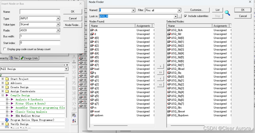 3)代码书写结束后,选择Processing>Start Compilation对编写的代码进行编译,编译通过后,建立波形文件,选择Insert Node or Bus,Node Finder,Filter中选择Pins:all,点击List,这样在Nodes Founder区域出现先前HDL文件中定义的输入、输出端口,点击>>,选择OK,如下图: