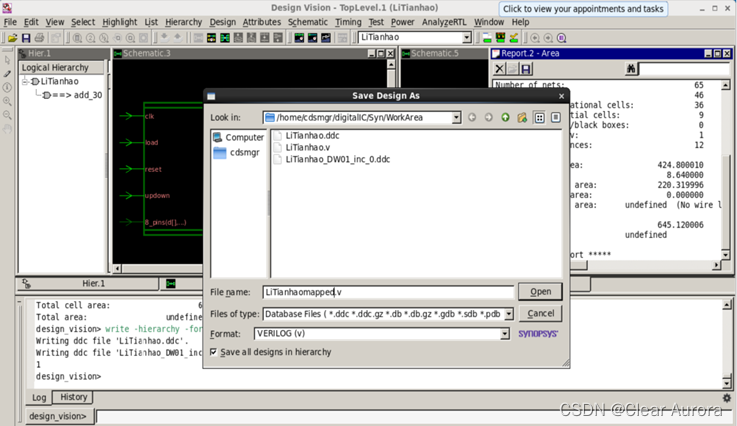 14)综合完成。在工作目录下找到综合后网表文件LiTianhaomapped.v和时钟约束条件文件LiTianhaomapped.sdc,用于后面的布局布线。