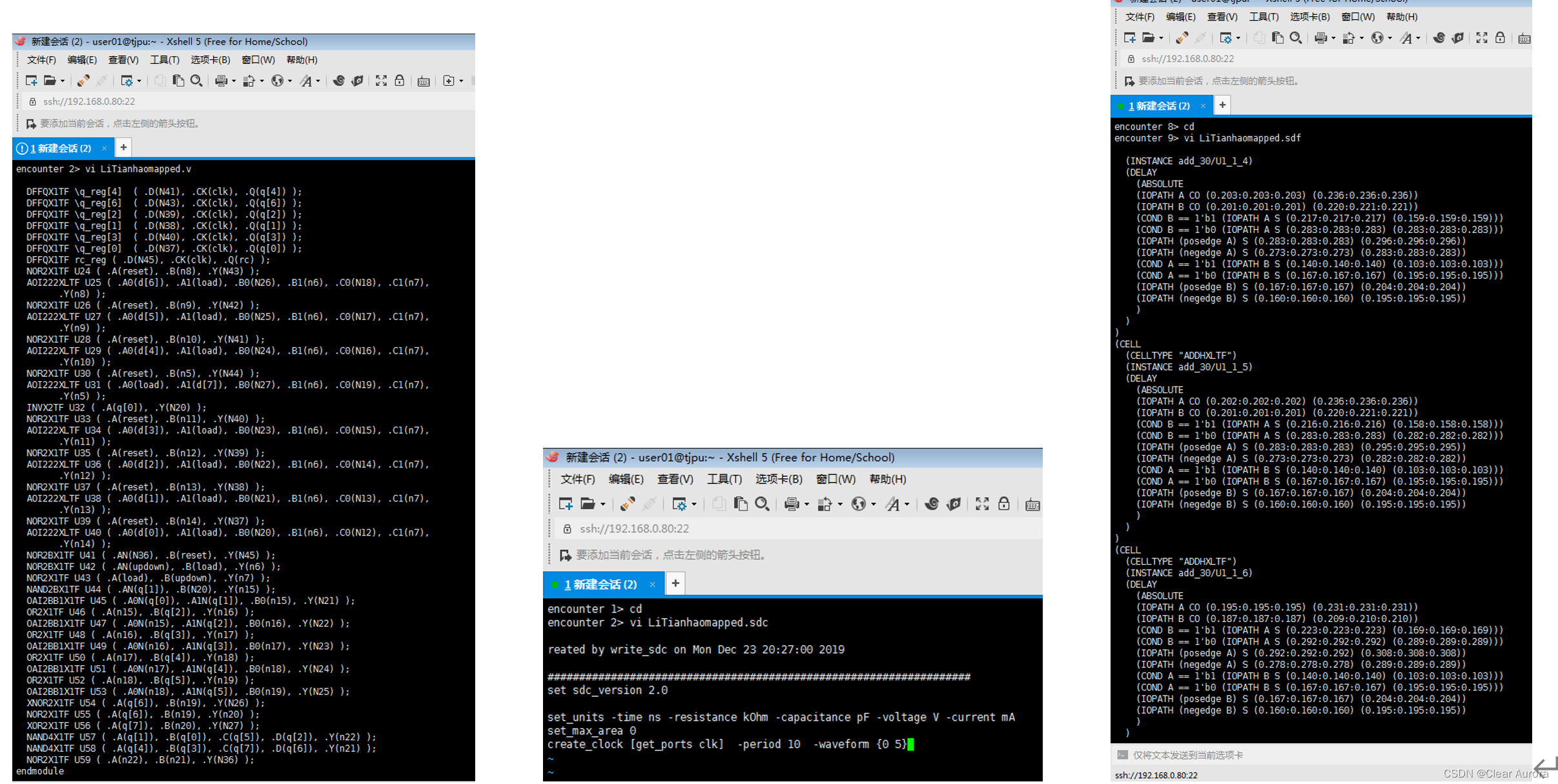 2)使用vi编辑器将综合后网表文件LiTianhaomapped.v和时钟约束条件文件LiTianhaomapped.sdc以及LiTianhaomapped.sdf文件导入主机,分别如下三图: