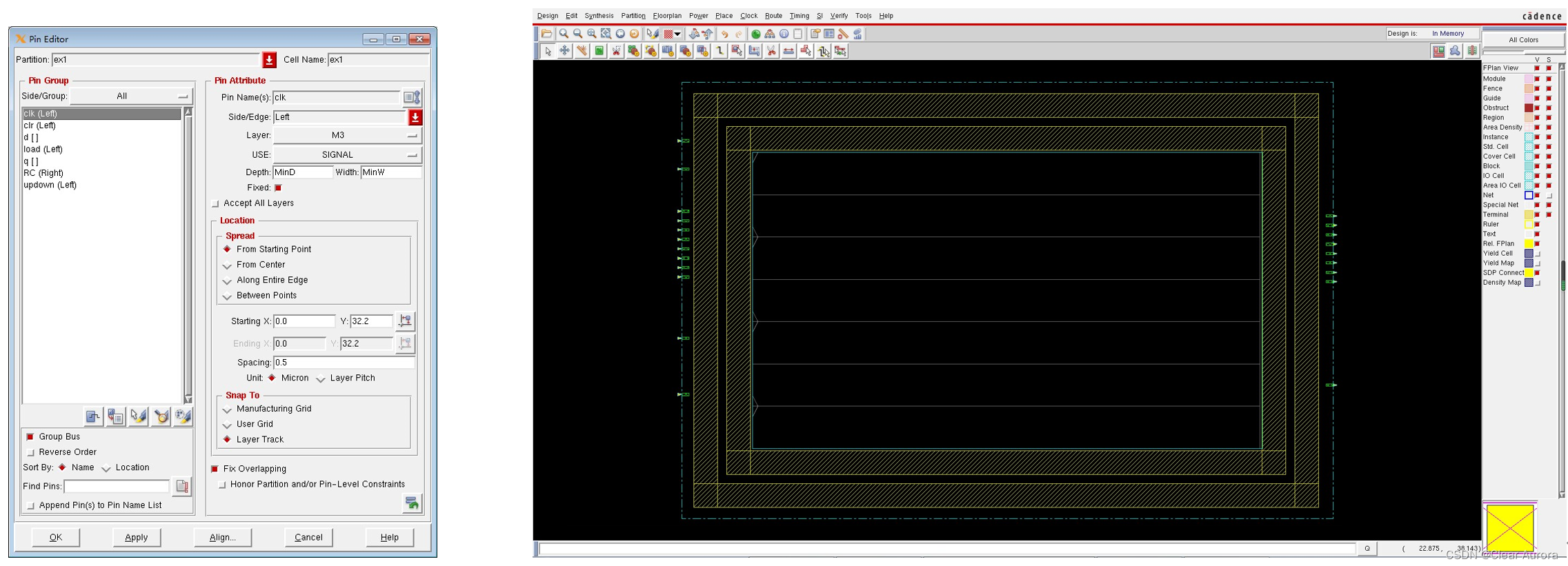 8)Edit -> Pin Editor进行端口定位,逐一设定各个端口的方位和使用的金属层、端口坐标,设置与结果如下两图: