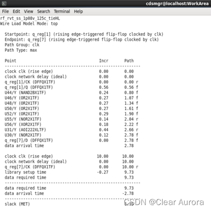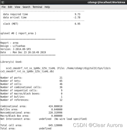 10)Timing->Report Timing Path,报告时序信息如下一图,其中slack(MET)大于0,满足设计时序要求;Design->Report Area,报告面积信息如下二图: