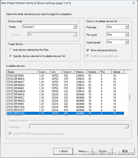 1)运行Quartus II,选择File>New Project Wizard,新建一个工程,FPGA芯片在Available device 列表中选择EP2C35F672C8: