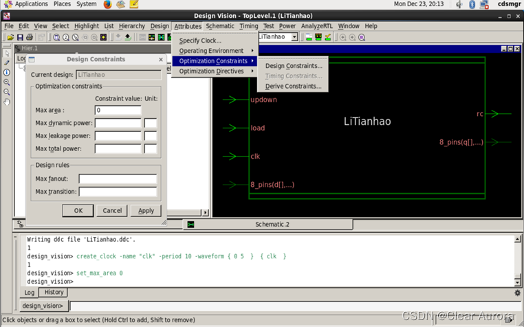 8)Attributes->Optimization Constraints–>Design Constraints,进行综合过程的条件约束设置,将面积优化到最小,如图:(可在Attributes->Optimization Constraints下设定优化时间等参数)