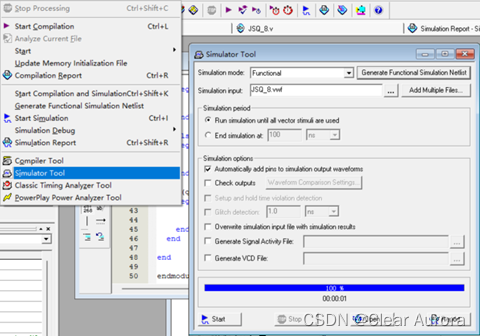 4)Processing>Simulation Tool,Simulation mode选择Functional(功能仿真),点击Generate Functional Simulation Netlist按键生成功能仿真网表(如要进行时序仿真,则Simulation Mode选择Timing),如下图: