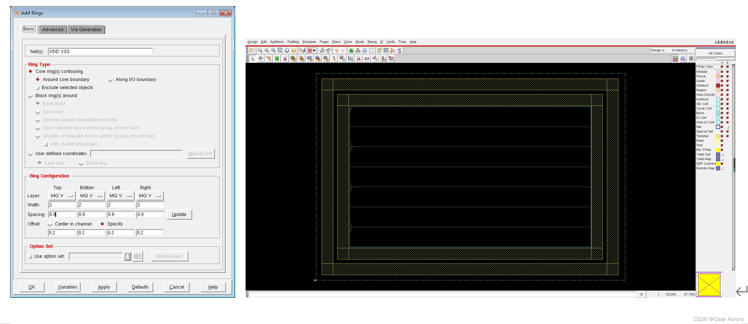 7)Power -> Power Planning -> Add Ring 添加电源线,设置与结果如下两图:
