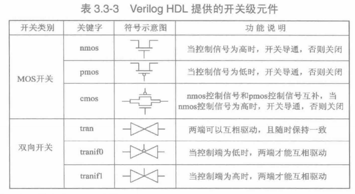 Verilog HDL提供了十几种开关级基本元件,它们是实际的MOS管的抽象表示。这些