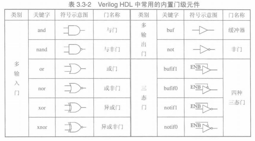 | 三态门 | 允许定义驱动强度 | bufif0, bufif1, notif0, notif1 |