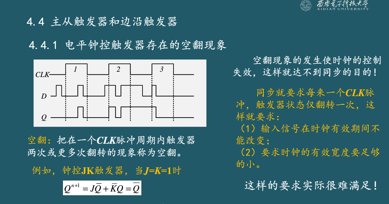 例如当钟控JK触发器jk均为1的时候是翻转功能,那么在钟控信号为1的时间段内,输出Q会不断的翻转翻转翻转再翻转。