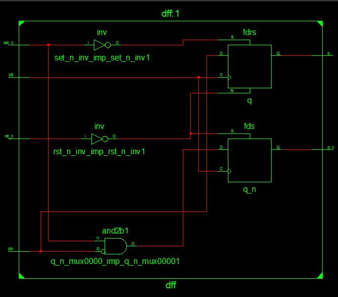 (可以看到器件本身的D触发器带有复位、置位端,但是高电平有效的,代码中是低电平有效,因此要经过一个非门;另外,期间本身的D触发器输出只有Q,没有~Q,因此需要两个D触发器实现所需功能)