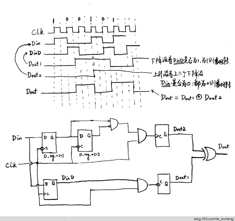 满足条件1的电路,应该由两部分构成。第一个部分在上升沿动作,完成延迟一个时钟周期。第二部分则在下降沿动作,当码元为1时在下降沿翻转Dout1,为一个T'触发器。