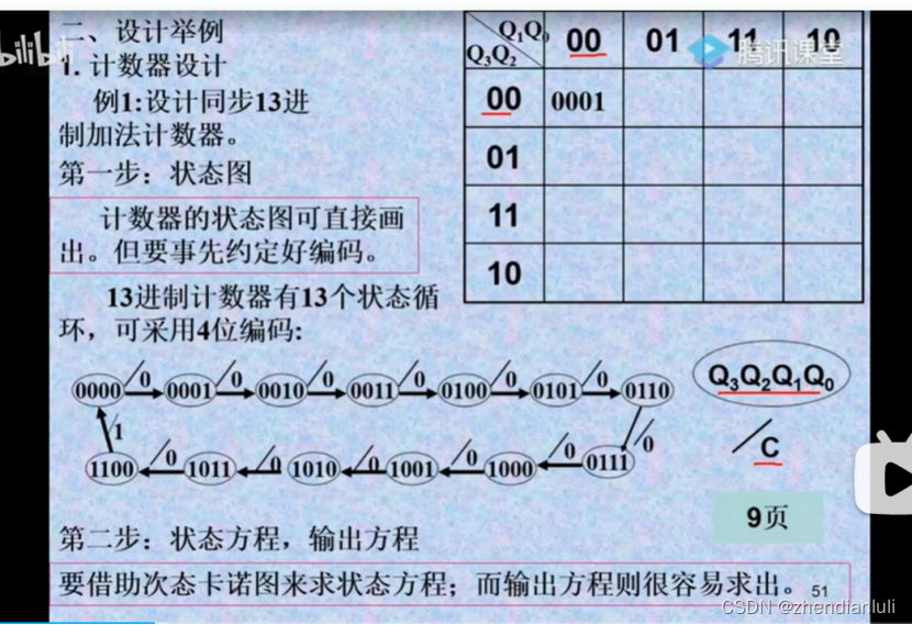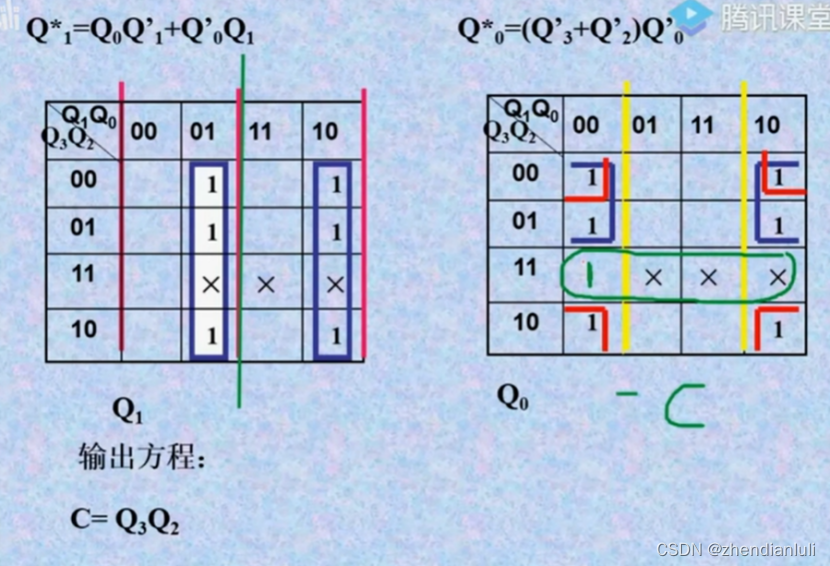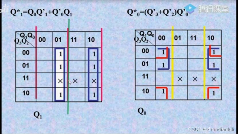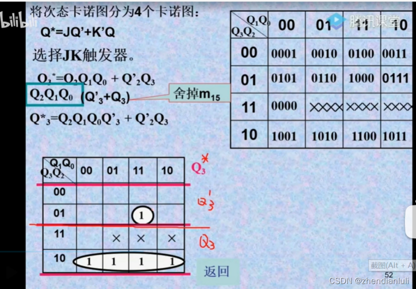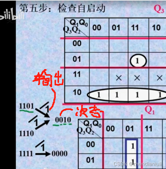 简便办法看次态,以无效状态1101为例,对Q3-0四个次态状态表找到对应的位置,看是否被圈住,被圈住为1,没被圈住为0,则对1101来说,其次态为0010.