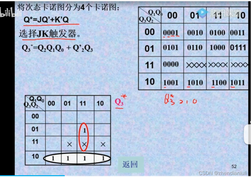 对于Q3*的卡诺图,将次态卡诺图的每一行的左数第一个数填入Q3*的卡诺图的对应的每一行。0省略,x一定要写;
