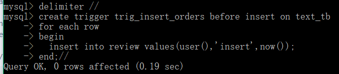 - 第二步:创建触发器(每当我们向text_tb表中插入数据时,review表就会插入一条新数据)。我们这里使用insert,delete与update的都是相同的原理。