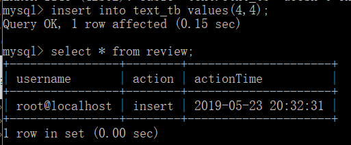 - 第三步:向text_tb表中插入数据,并且查看review表是否有记录。