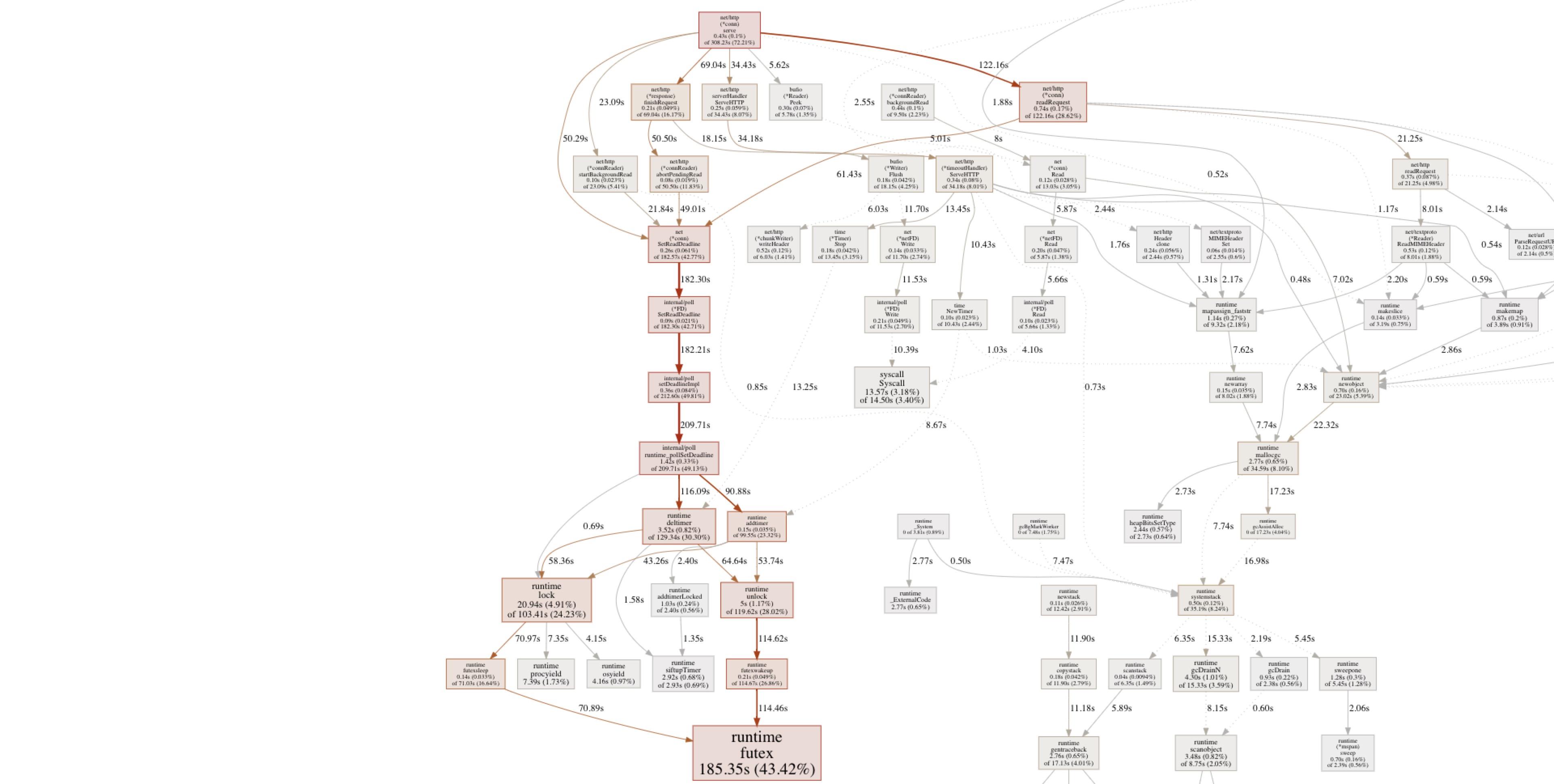 这里futex 怎么这么高?看着上面的一些操作,addtimer, deltimer 我想到以前的自己实现的定时器,这估计是超时引起的。然后检查版本,go1.9, 然后框架默认为每个conn 设置了4个timeout,readtimeout, writetimeout, idletimeout, headertimeout ,这直接导致了定时器在添加和删除回调的时候,锁的压力特别大。