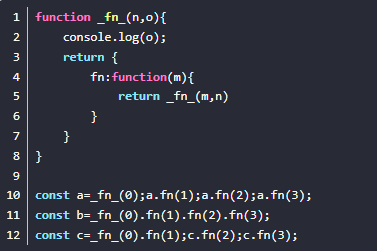 • 第二次调用 .fn(1) 时 m 为 1,此时 fn 闭包了外层函数的 n ,也就是第一次调用的 n=0,即 m=1,n=0,并在内部调用第一层的_fn_(1,0);所以 o 为 0;