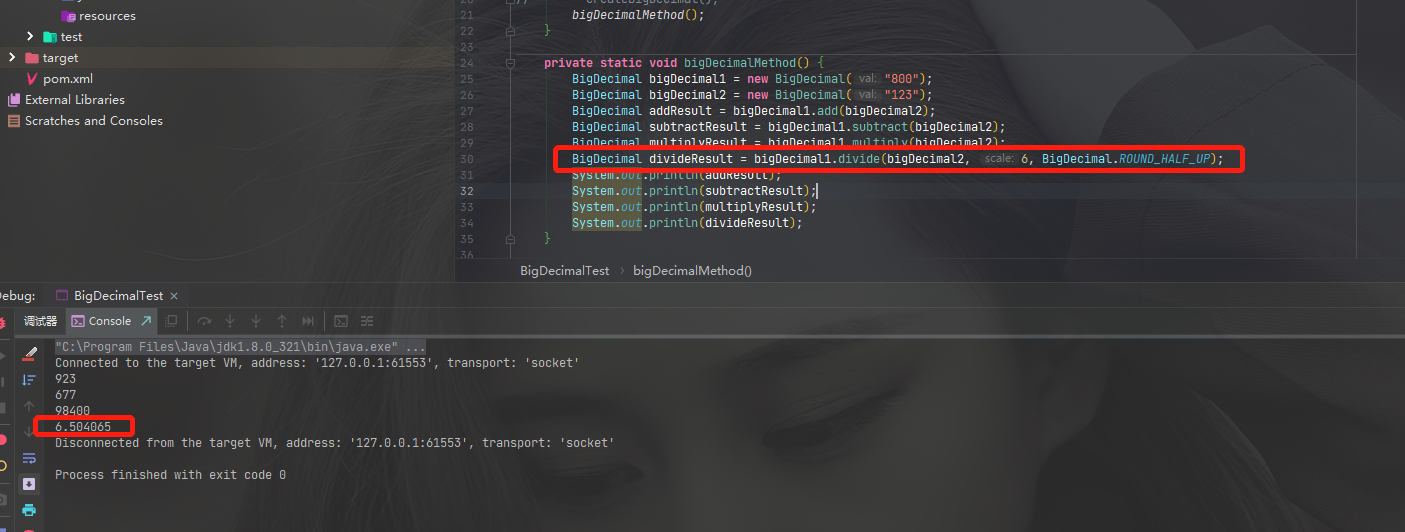 该方法会有 3 个参数,divisor 表示除数,scale 表示最终结果保留几位小数,roundingMode 表示保留小数的原则,即四舍五入还是直接舍弃,一般情况下都是使用 BigDecimal.ROUND_HALF_UP 四舍五入的原则。如,我们对以上代码的 divide() 方法设置使用四舍五入的原则保留 6 位小数,那么最终计算结果就为: