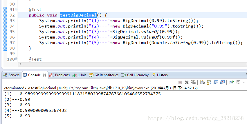 所以在0.99f转成double时,进行了精度扩展,变成了0.9900000095367432,而接着转成字符串,最后转成BigDecimal.